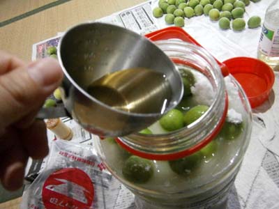 梅、砂糖、梅、砂糖、と、交互に入れていきます。